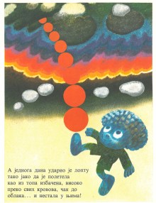 Priča slikovnice “Dečak i lopta” govori o dečaku Miši koji je dobio žutu loptu za rođendan. Lopta je uvek odskakala toliko visoko da je često završavala na vrhu hrasta ili na krovu. Miša je naučio da loptu šutira sve jače i jače dok je jednom nije toliko snažno udario da je otišla “preko svih oblaka, čak do krovova” i “prosto se zabila u nebo”!
