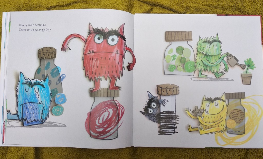 Radost je žuta, tuga plava, ljutna je crvena, strah crn, zelena je smirenost, a ljubav roze. Kada je svako osećanje definisano i smešteno u svoju teglicu, čudovište je bistre glave i, čini se, čak i zaljubljeno! 🙂